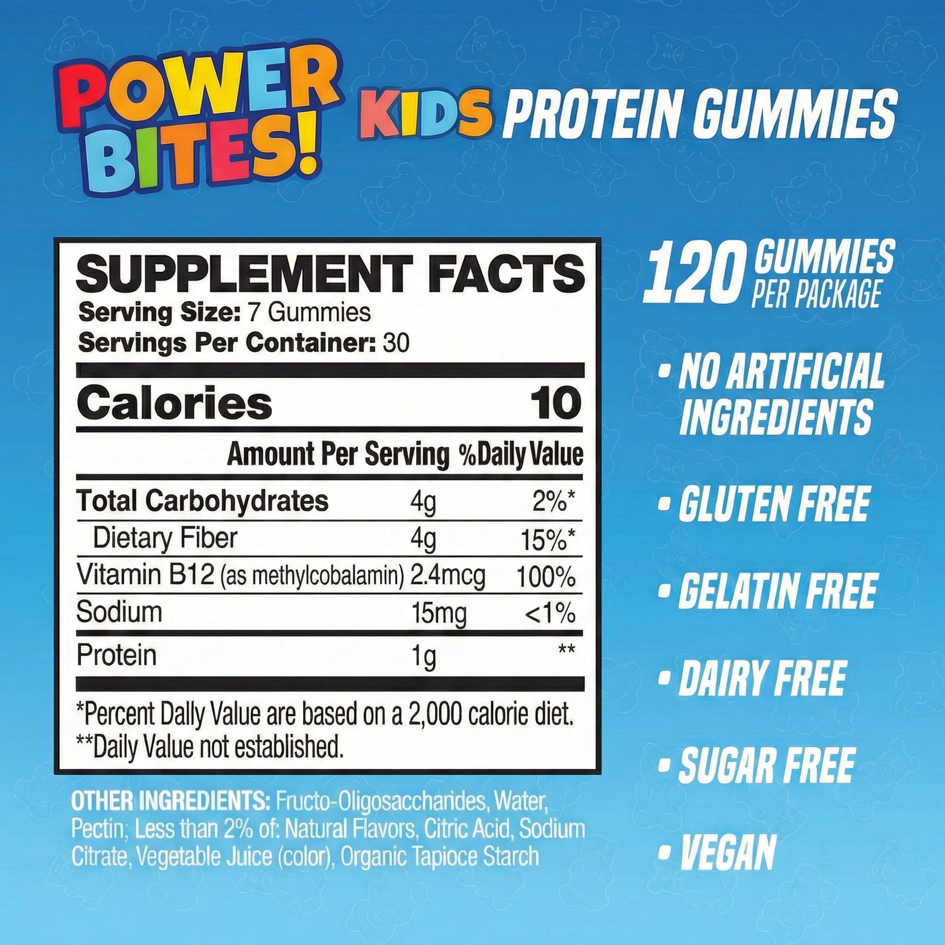 Each Power Bite contains 1 gram of protein. Most parents give 2–4 gummies per day as an easy way to add protein during snack time.